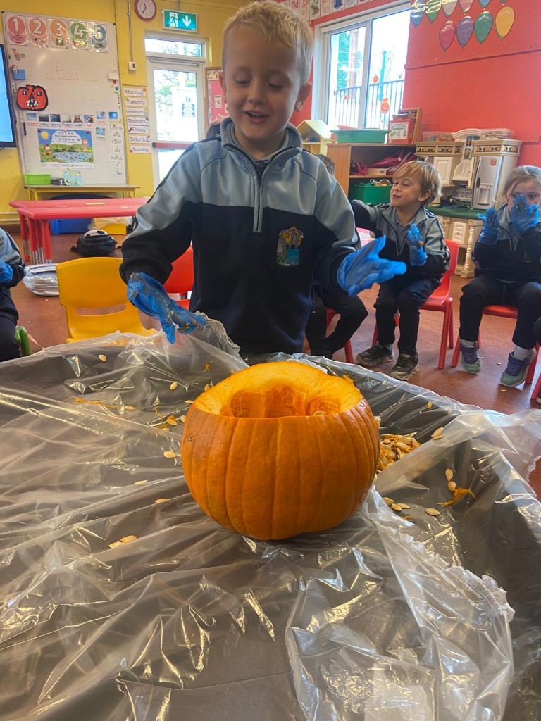 To celebrate Halloween Junior Infants dressed up in scary costumes and carved out pumpkins in class.